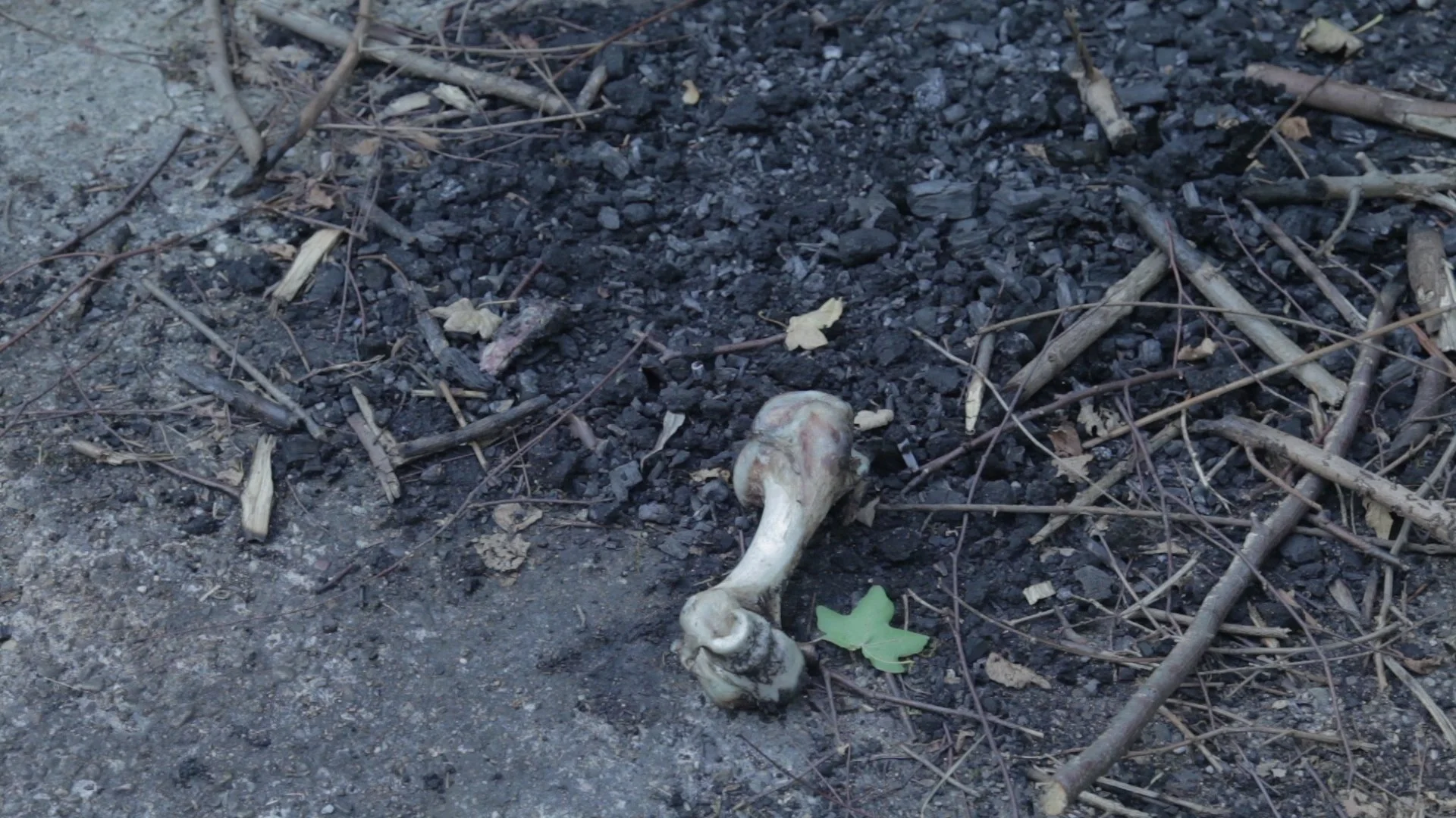 A spot by a fire place. The surrounding bushes rustle and crackle as if from sparks and snapping twigs. Next to the ashes lies a large bone and a dirty tuxedo jacket.