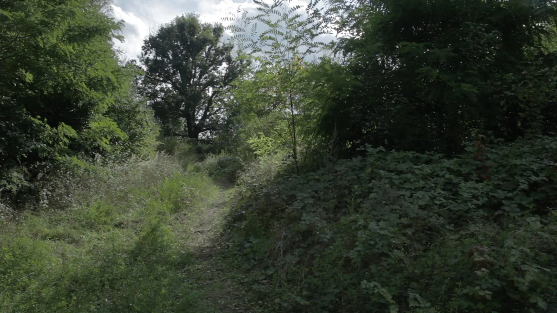 Concrete slabs, street lamps, and a stack of pallets can be found beneath the dense vegetation. The buzzing of blowflies adds to the threatening acoustic atmosphere. From a pool of half-coagulated blood that attracts numerous insects a trail leads through the undergrowth.