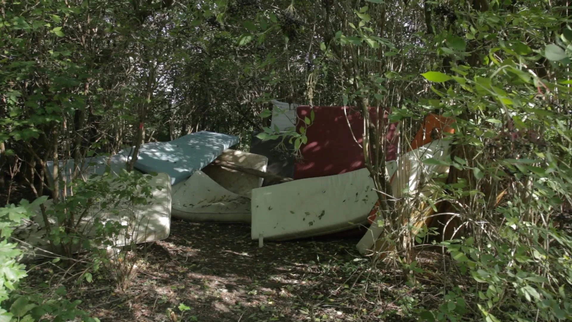 A turning leads into a copse to a pile of old mattresses. From here tactile sounds of fabric being stroked and quiet breathing noises can be heard. On the floor between the cushions lies the skull of a dog-like predator. Finally the path leads out into the open to the street with the waiting taxi.