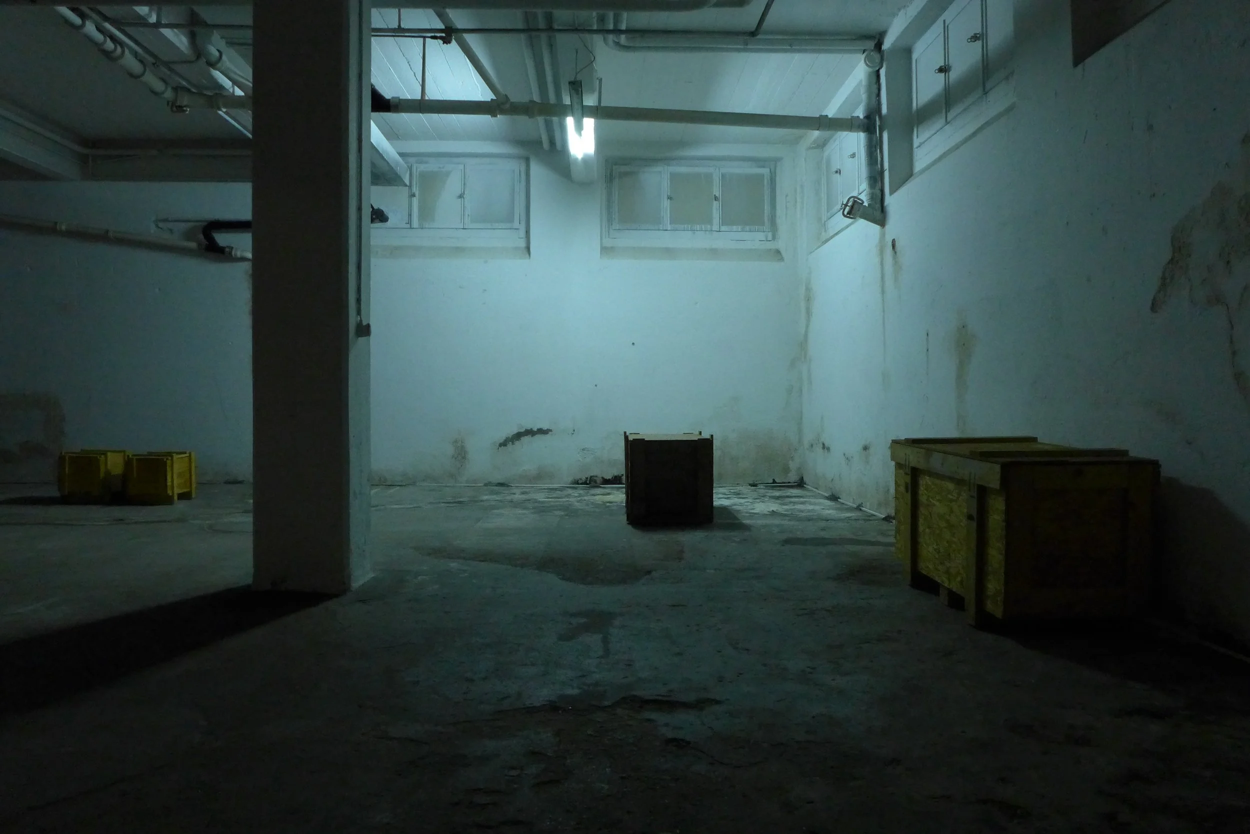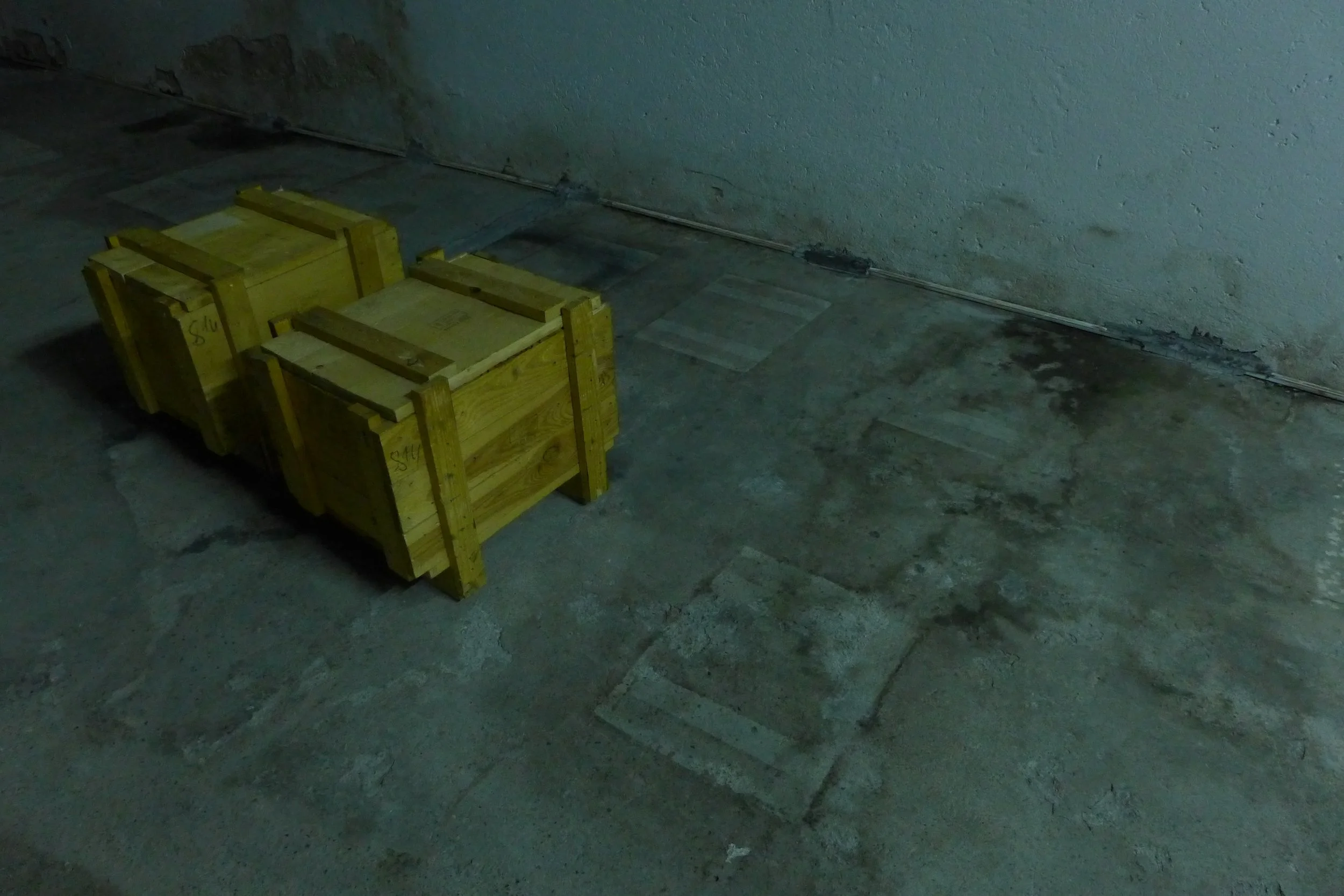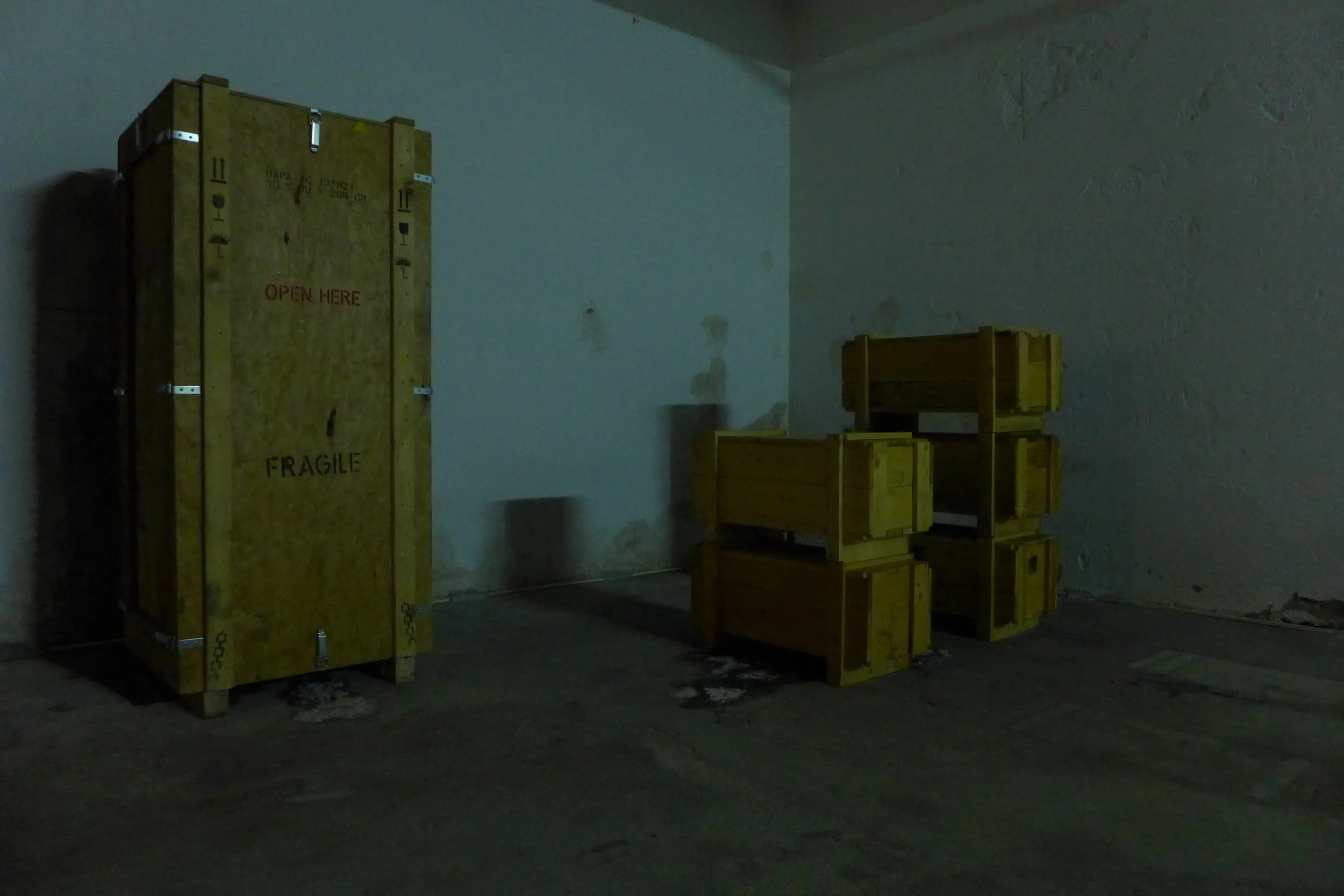 The audience enters the room via the freight elevator and finds itself in an atmosphere of sparse light, traces and sedimentations on the walls and floor and between locked transport crates.
