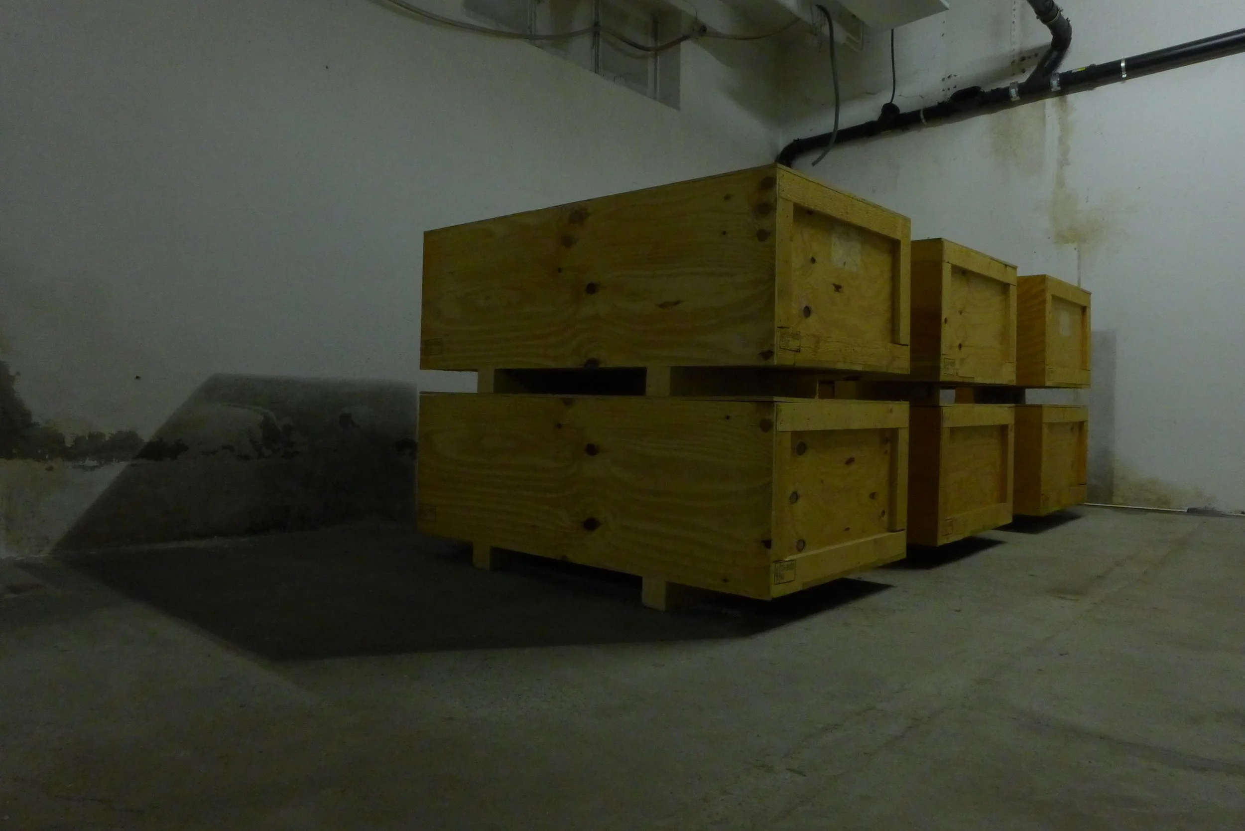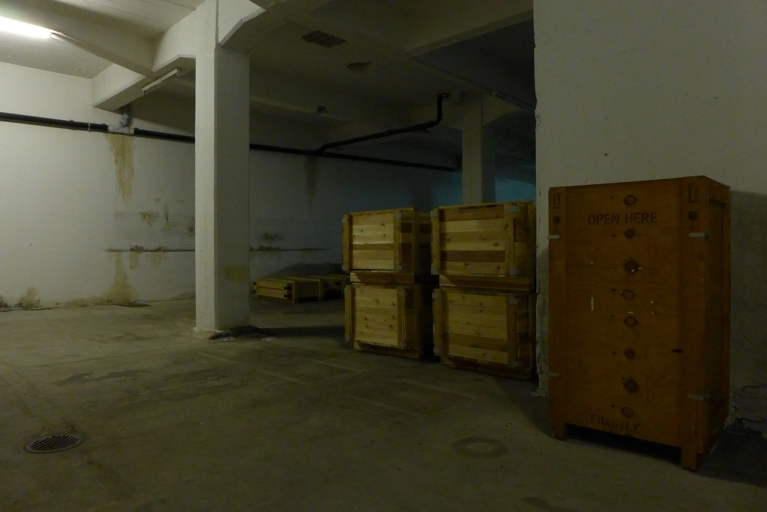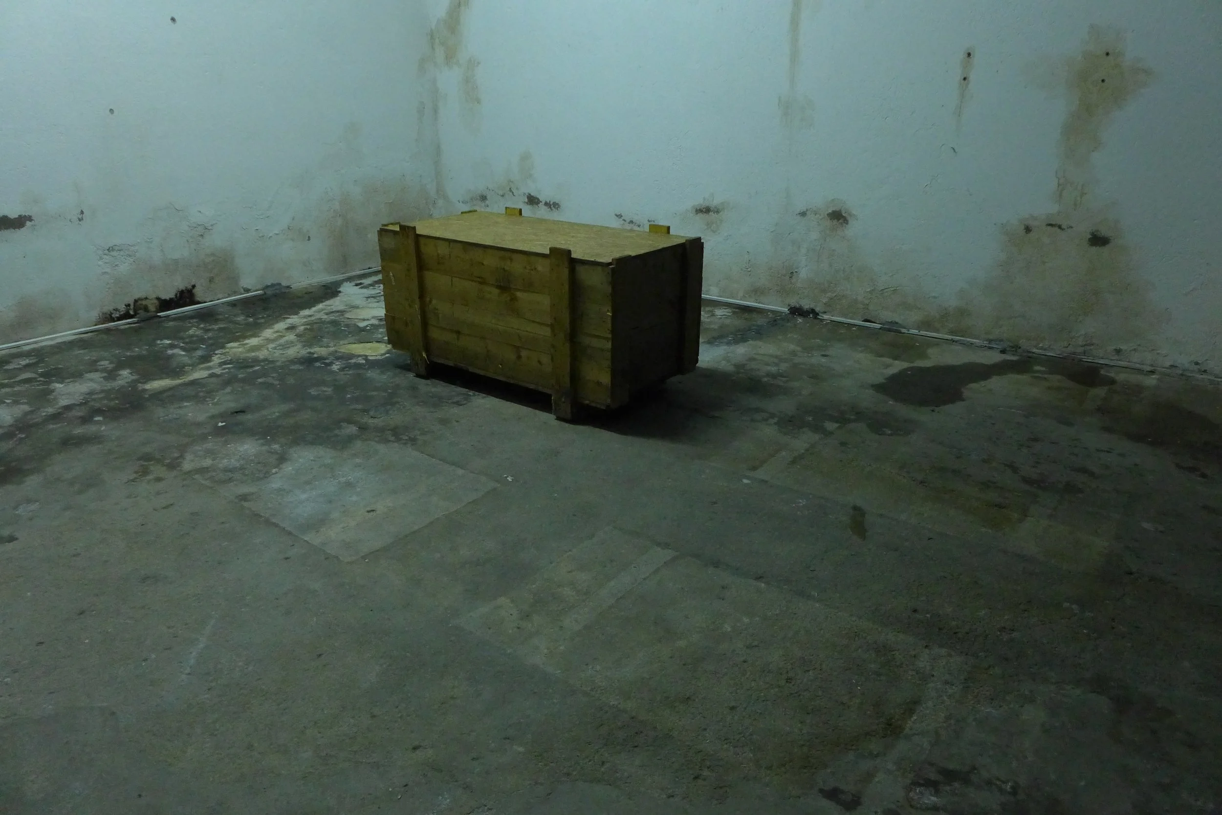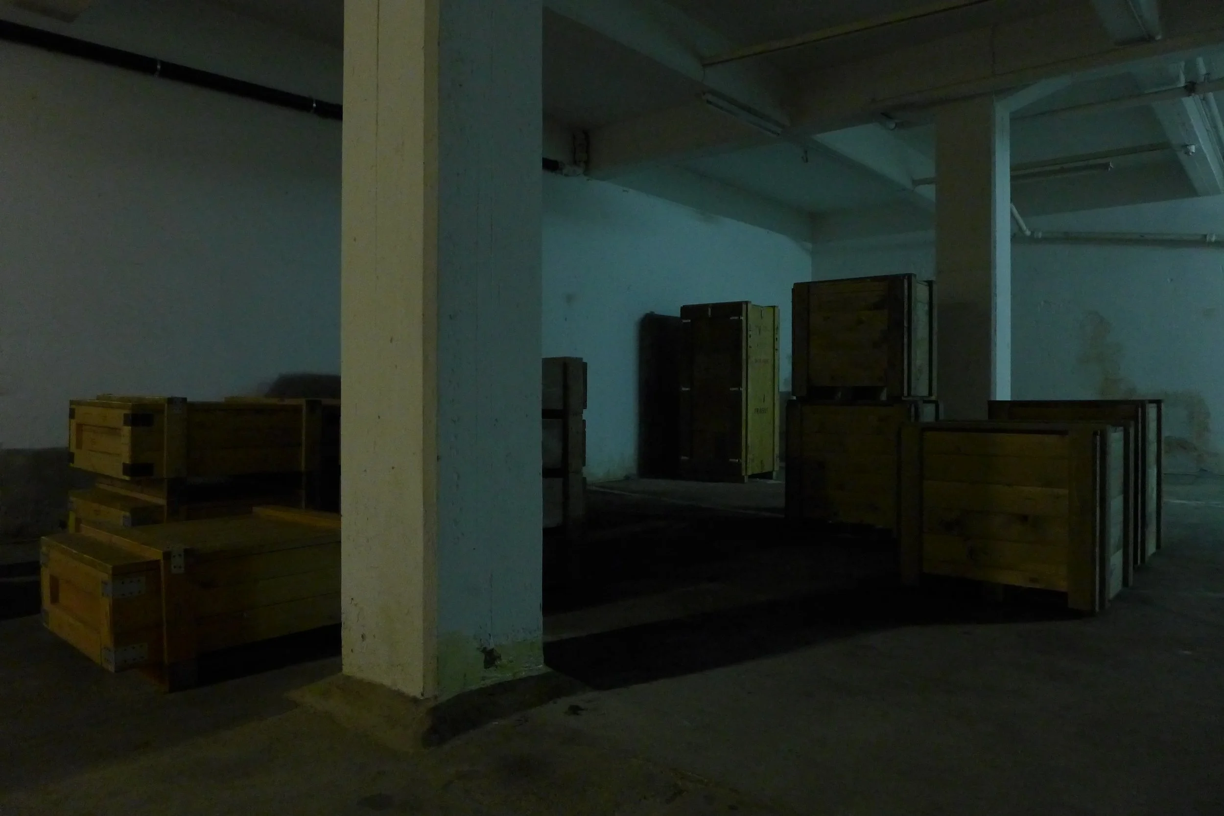 The audience enters the room via the freight elevator and finds itself in an atmosphere of sparse light, traces and sedimentations on the walls and floor and between locked transport crates.